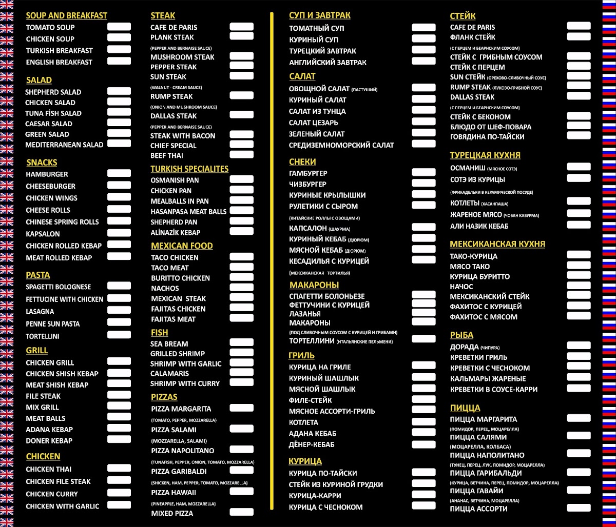 The menu at Sun Restaurant Cafe & Bar in Alanya offers a delightful mix of Mediterranean and Turkish flavors, catering to a variety of tastes. For meat lovers, Pepper Steak and Plank Steak stand out as hearty, flavorful dishes. The Grilled Shrimp and Scrimps Casserolle offer a fresh and satisfying seafood experience, ideal for those seeking something lighter yet equally delicious. If you're in the mood for something more traditional, the Šiš Kebab and Grilled Lammespyd are excellent choices, showcasing the authentic taste of Turkish cuisine.